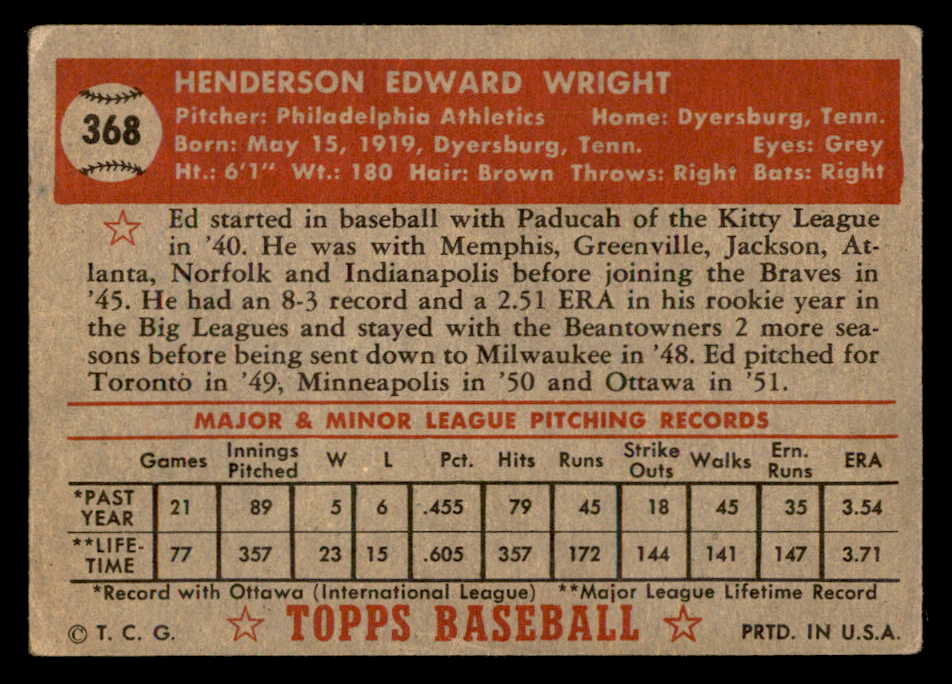 1952 Topps Baseball #368 Ed Wright A's VG-EX 544389