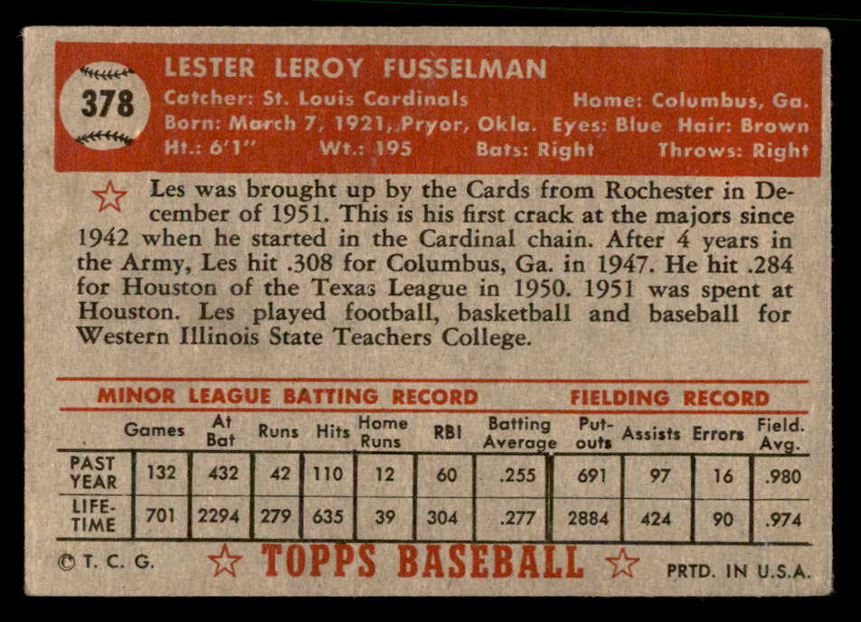 1952 Topps Baseball #378 Les Fusselman Cardinals VG-EX 544393