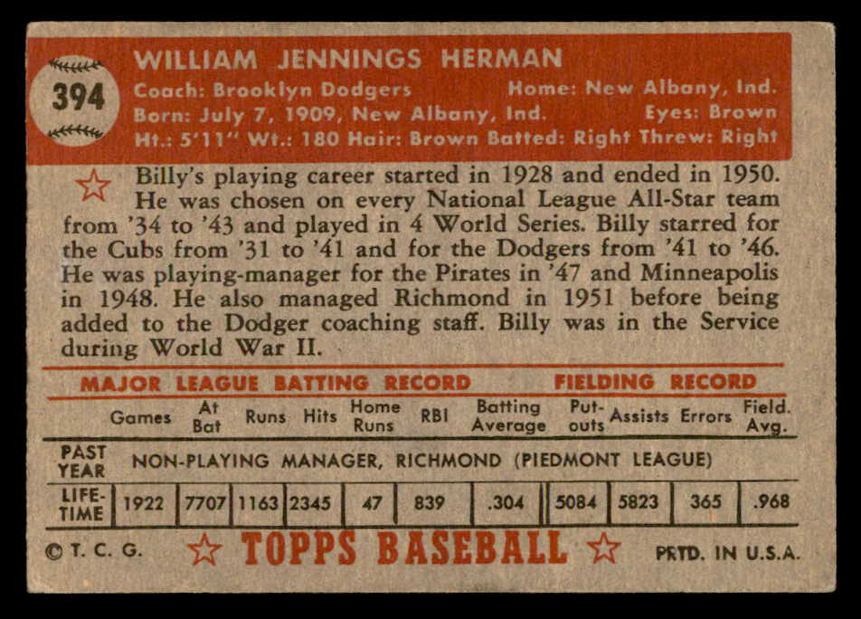 1952 Topps Baseball #394 Billy Herman Dodgers VG-EX 544398