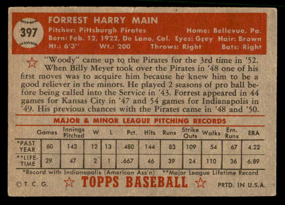 1952 Topps Baseball #397 Forrest Main Pirates VG-EX 544399
