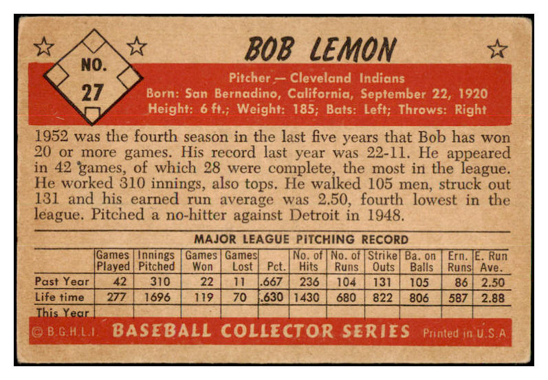 1953 Bowman Black & White Baseball #027 Bob Lemon Indians VG-EX 532260