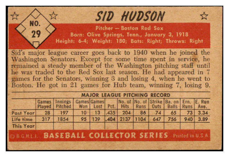 1953 Bowman Black & White Baseball #029 Sid Hudson Red Sox VG-EX 532263