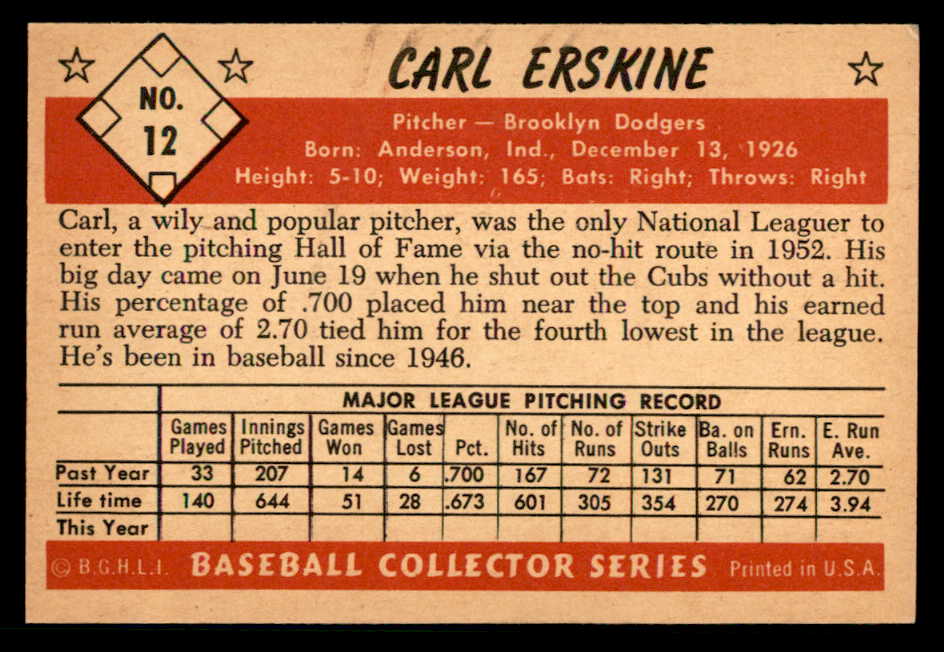 1953 Bowman Color Baseball #012 Carl Erskine Dodgers VG-EX 542003