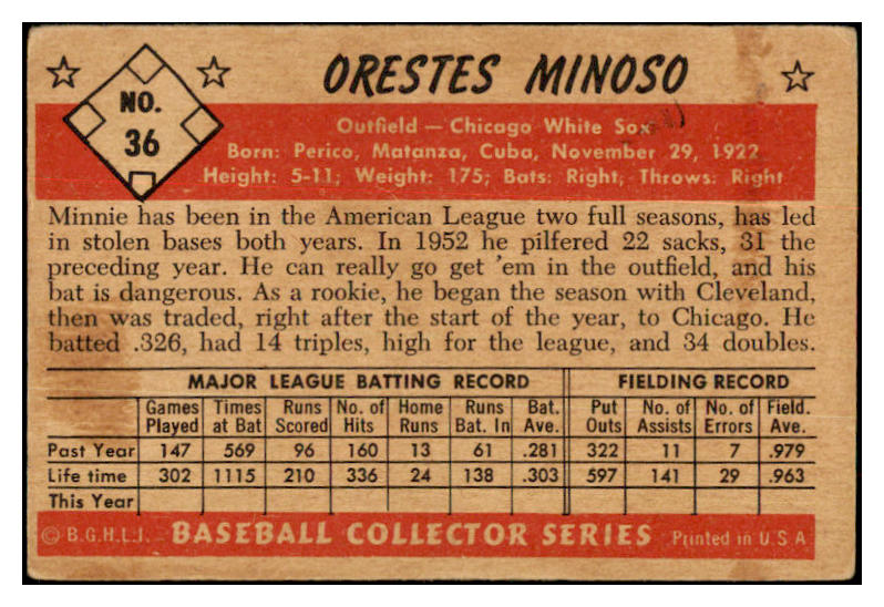 1953 Bowman Color Baseball #036 Minnie Minoso White Sox VG-EX 532259