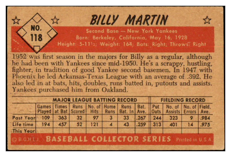 1953 Bowman Color Baseball #118 Billy Martin Yankees VG-EX 532261