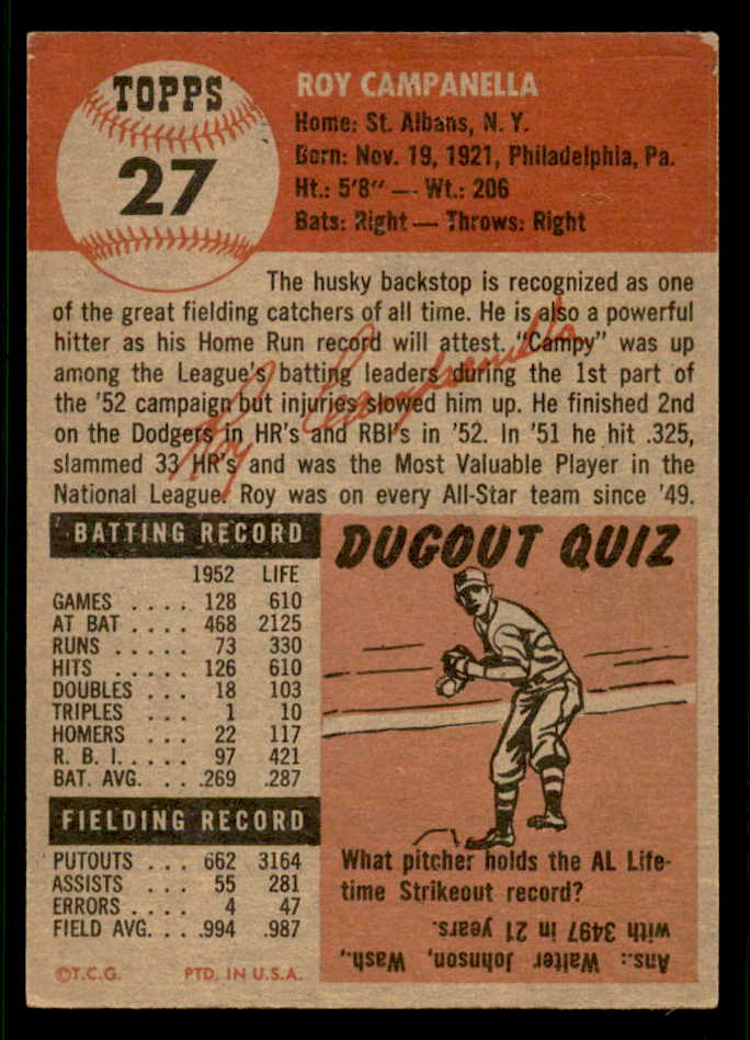 1953 Topps Baseball #027 Roy Campanella Dodgers VG-EX 541843