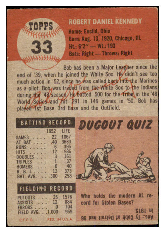 1953 Topps Baseball #033 Bob Kennedy Indians EX 528628