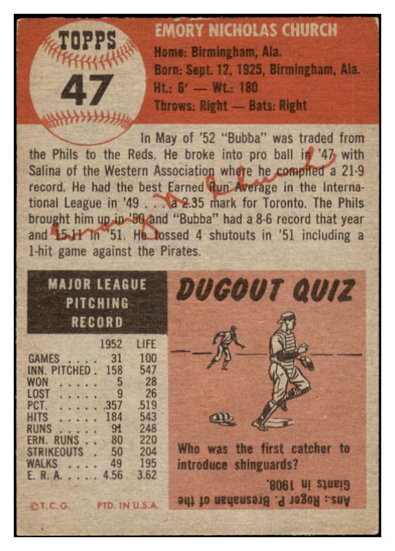 1953 Topps Baseball #047 Bubba Church Reds EX 528706
