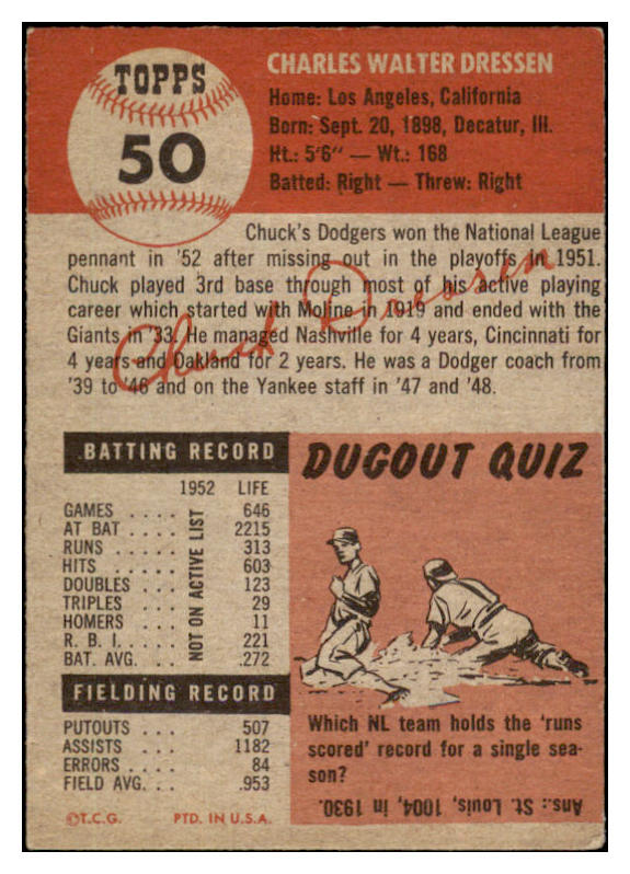 1953 Topps Baseball #050 Chuck Dressen Dodgers EX-MT 529306