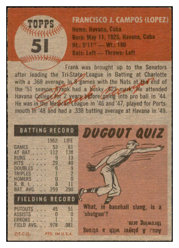 1953 Topps Baseball #051 Frank Campos Senators EX-MT 533840