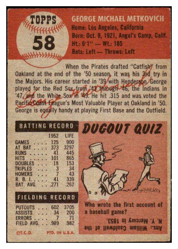 1953 Topps Baseball #058 George Metkovich Pirates EX 528634