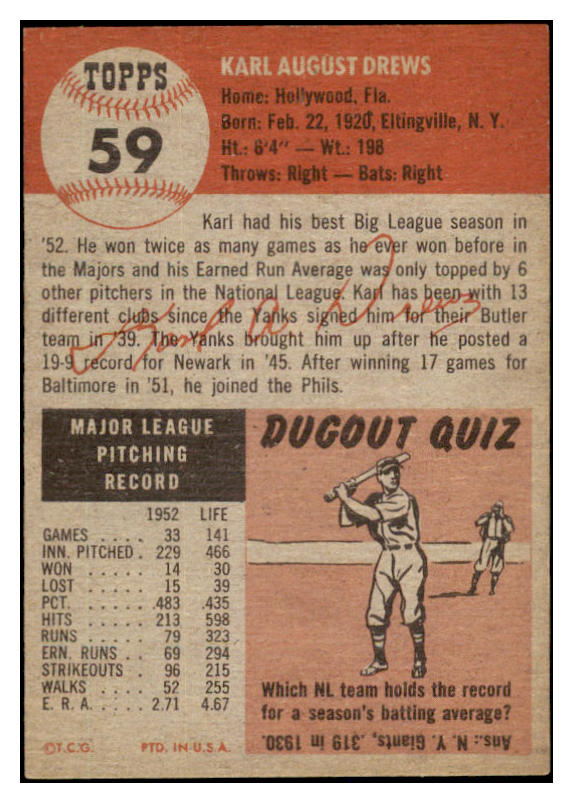 1953 Topps Baseball #059 Karl Drews Phillies EX-MT 529305