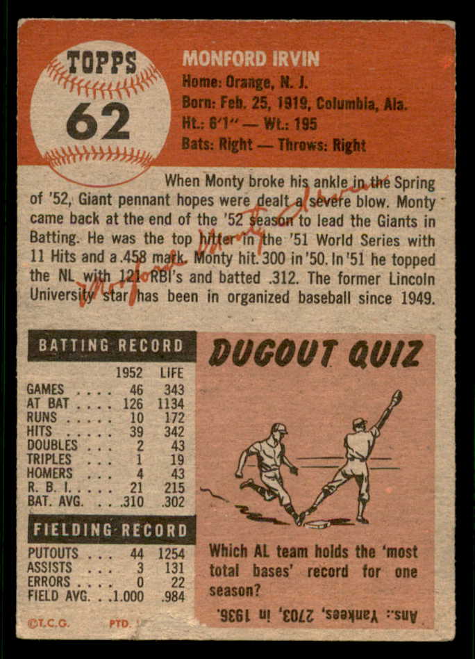1953 Topps Baseball #062 Monte Irvin Giants VG-EX 541978
