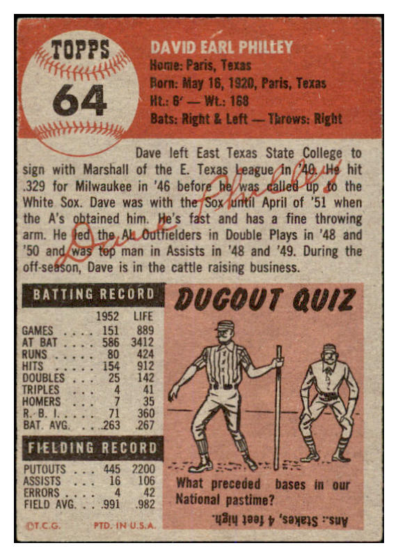 1953 Topps Baseball #064 Dave Philley A's EX 528712