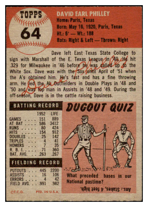 1953 Topps Baseball #064 Dave Philley A's EX-MT 528601