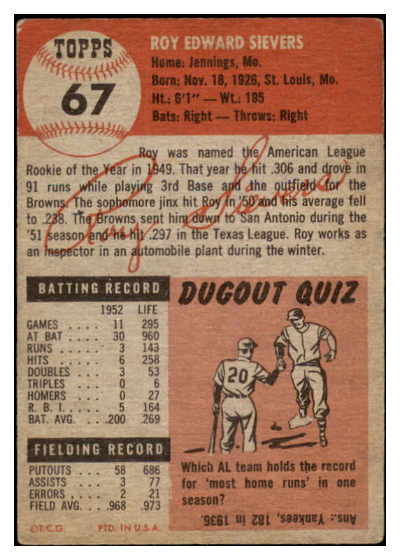 1953 Topps Baseball #067 Roy Sievers Browns VG-EX 528654