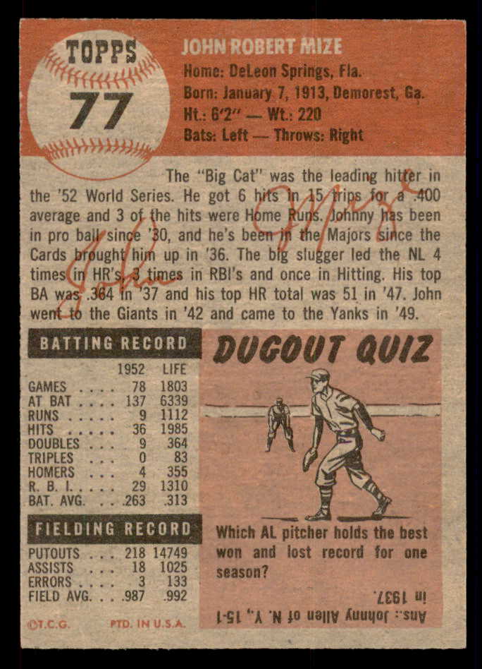 1953 Topps Baseball #077 Johnny Mize Yankees EX-MT 546991