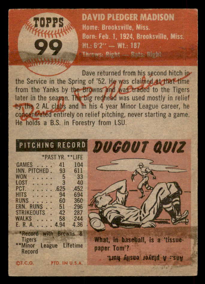 1953 Topps Baseball #099 Dave Madison Tigers VG-EX 546745