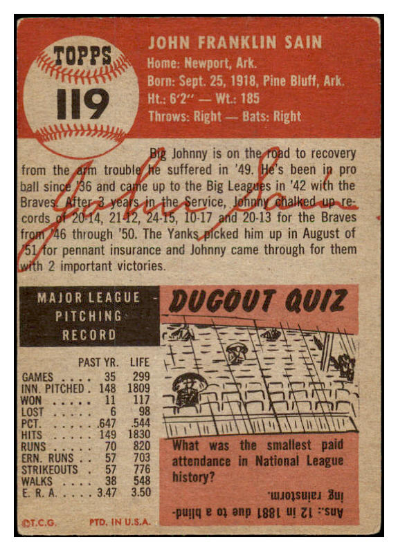 1953 Topps Baseball #119 Johnny Sain Yankees VG-EX 528102