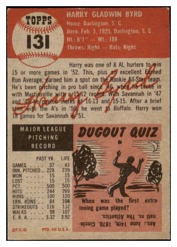 1953 Topps Baseball #131 Harry Byrd A's EX-MT 528684