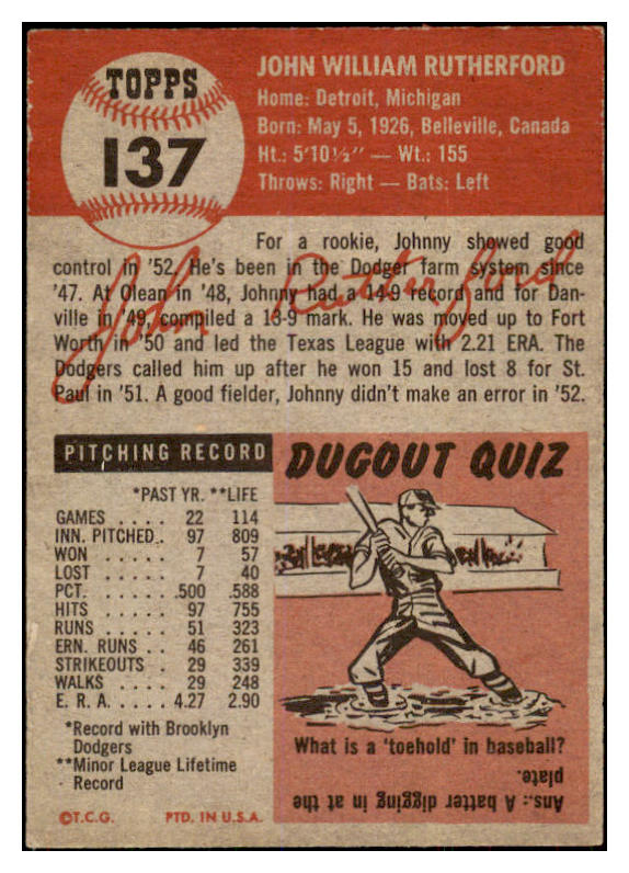 1953 Topps Baseball #137 John Rutherford Dodgers EX-MT 506522