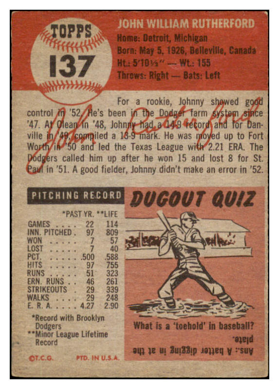 1953 Topps Baseball #137 John Rutherford Dodgers EX-MT 529302