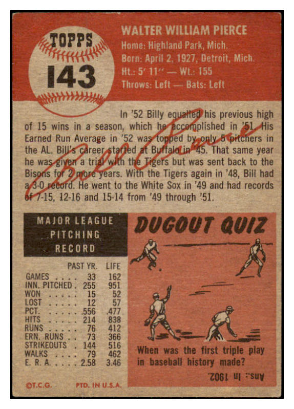 1953 Topps Baseball #143 Billy Pierce White Sox VG-EX 528114