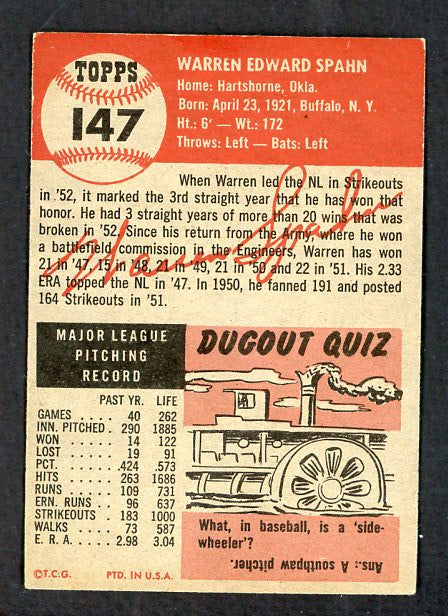 1953 Topps Baseball #147 Warren Spahn Braves EX 538558