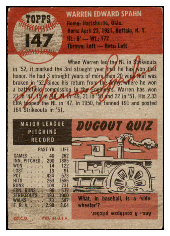1953 Topps Baseball #147 Warren Spahn Braves VG-EX 525641