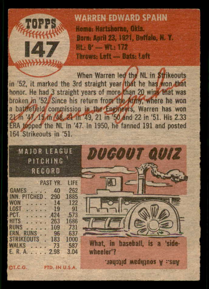 1953 Topps Baseball #147 Warren Spahn Braves VG-EX 541839