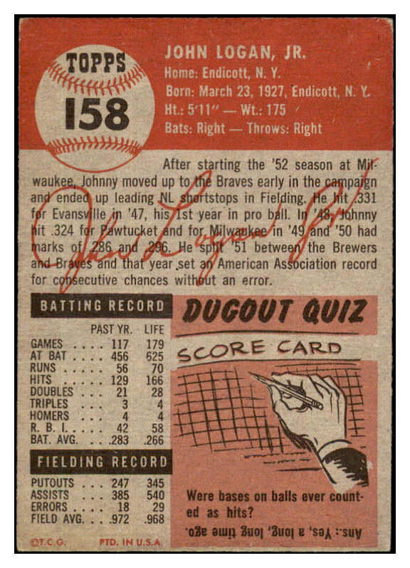 1953 Topps Baseball #158 John Logan Braves VG-EX 529309