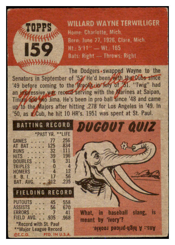1953 Topps Baseball #159 Wayne Terwilliger Senators EX 528647