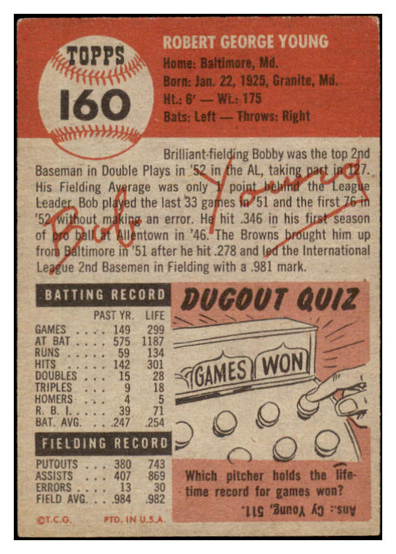 1953 Topps Baseball #160 Bob Young Browns EX-MT 529301