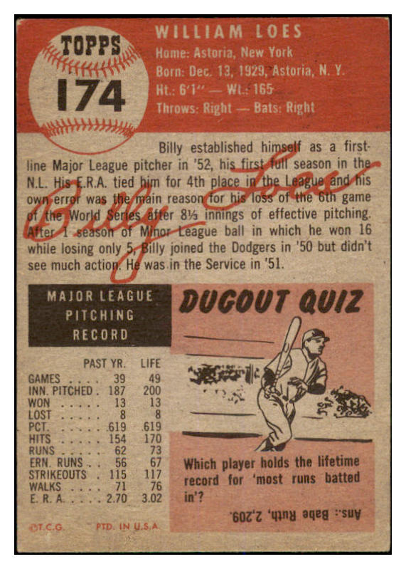 1953 Topps Baseball #174 Billy Loes Dodgers VG-EX 528668