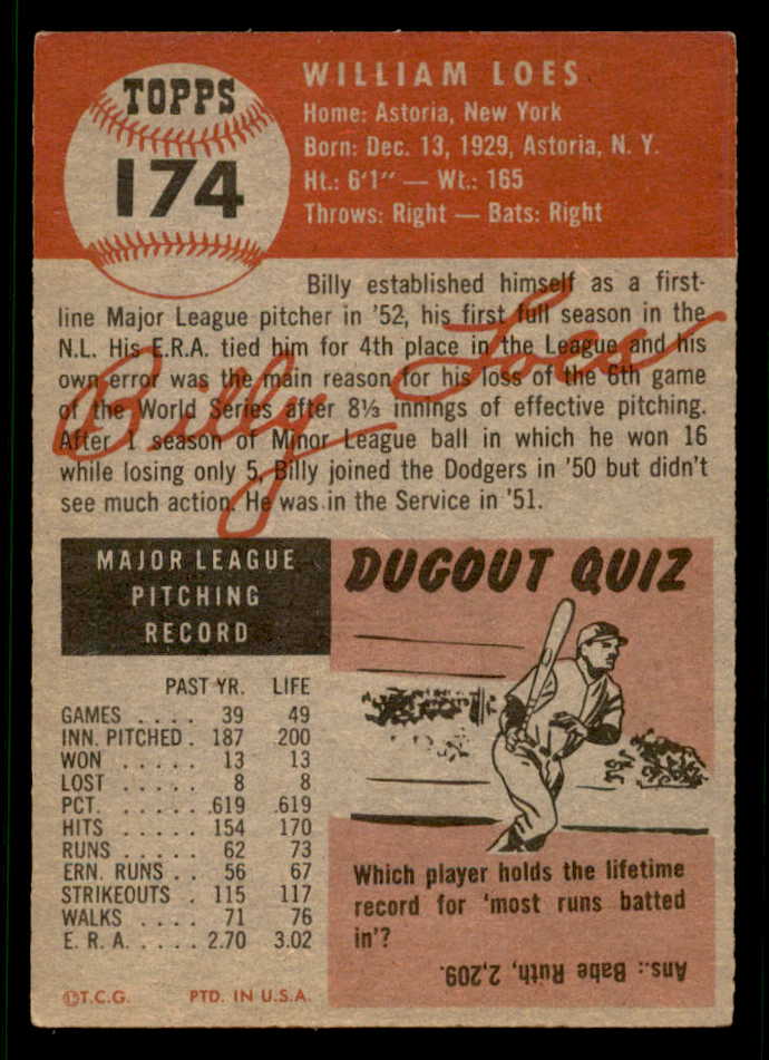 1953 Topps Baseball #174 Billy Loes Dodgers VG-EX 541953