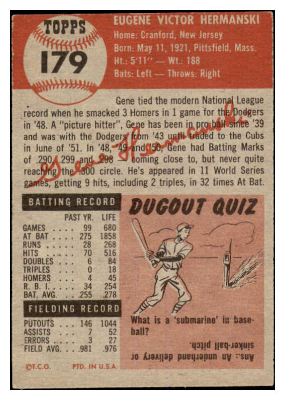 1953 Topps Baseball #179 Gene Hermanski Cubs EX-MT 528689