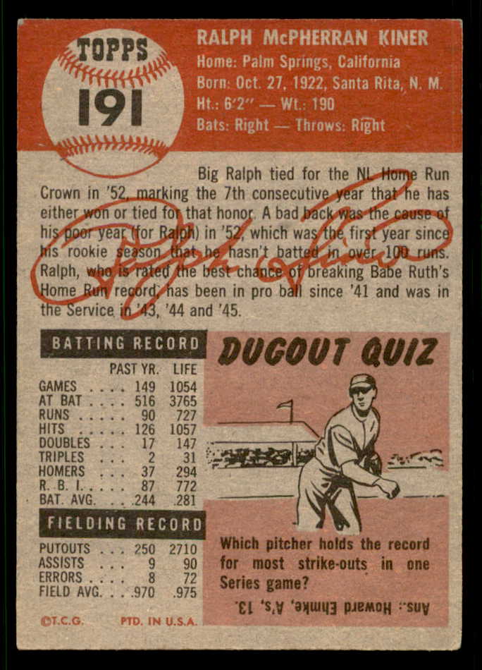 1953 Topps Baseball #191 Ralph Kiner Pirates VG-EX 541852