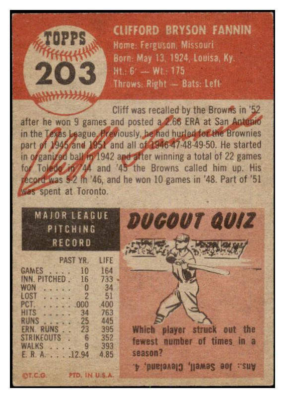 1953 Topps Baseball #203 Cliff Fannin Browns EX 528650