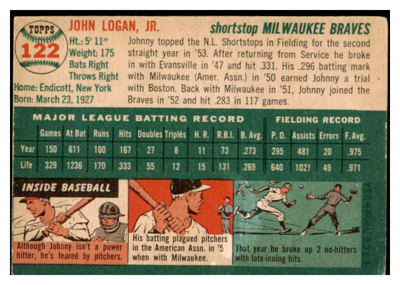 1954 Topps Baseball #122 Johnny Logan Braves VG-EX 530688