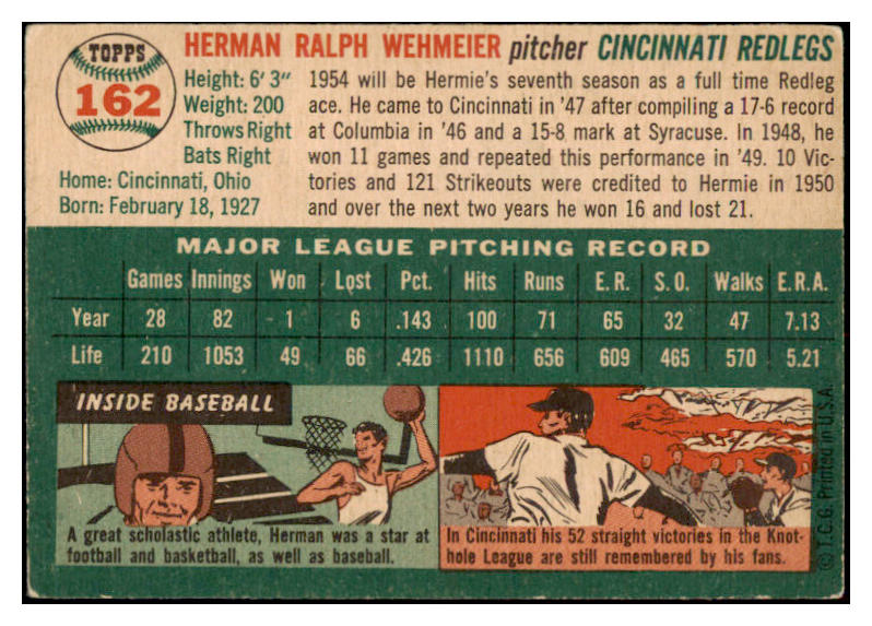 1954 Topps Baseball #162 Herman Wehmeier Reds VG-EX 530705
