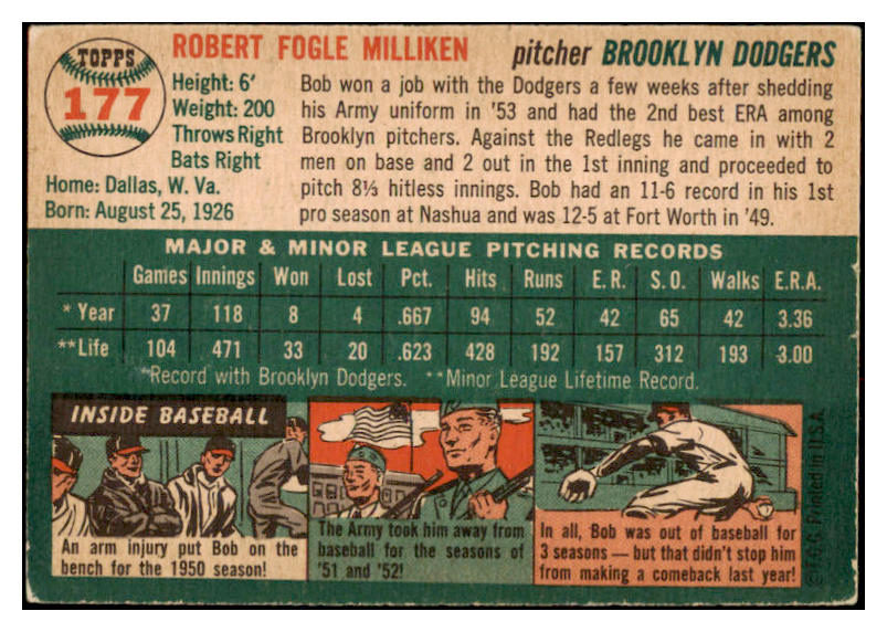 1954 Topps Baseball #177 Bob Milliken Dodgers VG-EX 530717