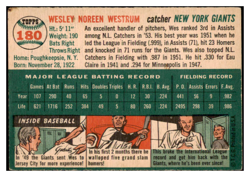 1954 Topps Baseball #180 Wes Westrum Giants VG-EX 530719