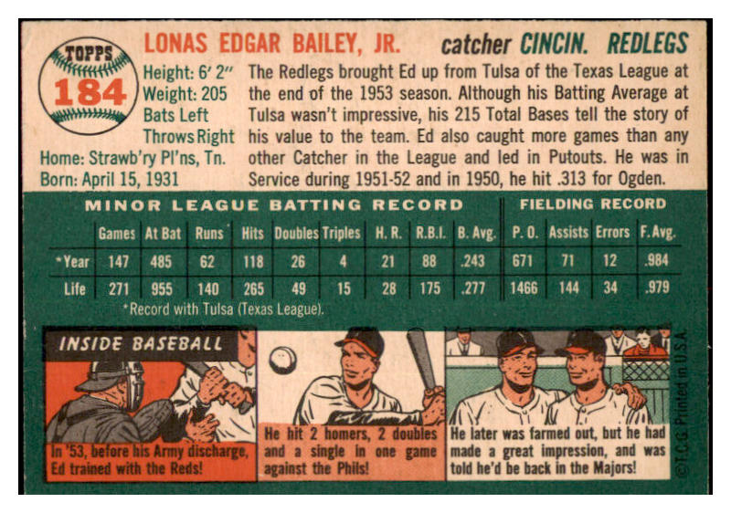 1954 Topps Baseball #184 Ed Bailey Reds VG-EX 530720