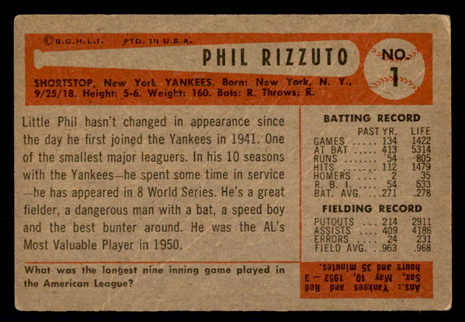 1954 Bowman Baseball #001 Phil Rizzuto Yankees VG 541146