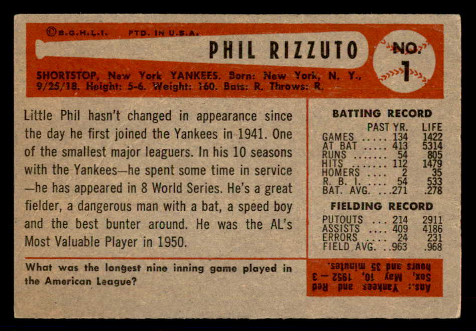 1954 Bowman Baseball #001 Phil Rizzuto Yankees VG 541147