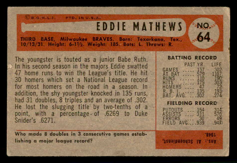 1954 Bowman Baseball #064 Eddie Mathews Braves VG 541149