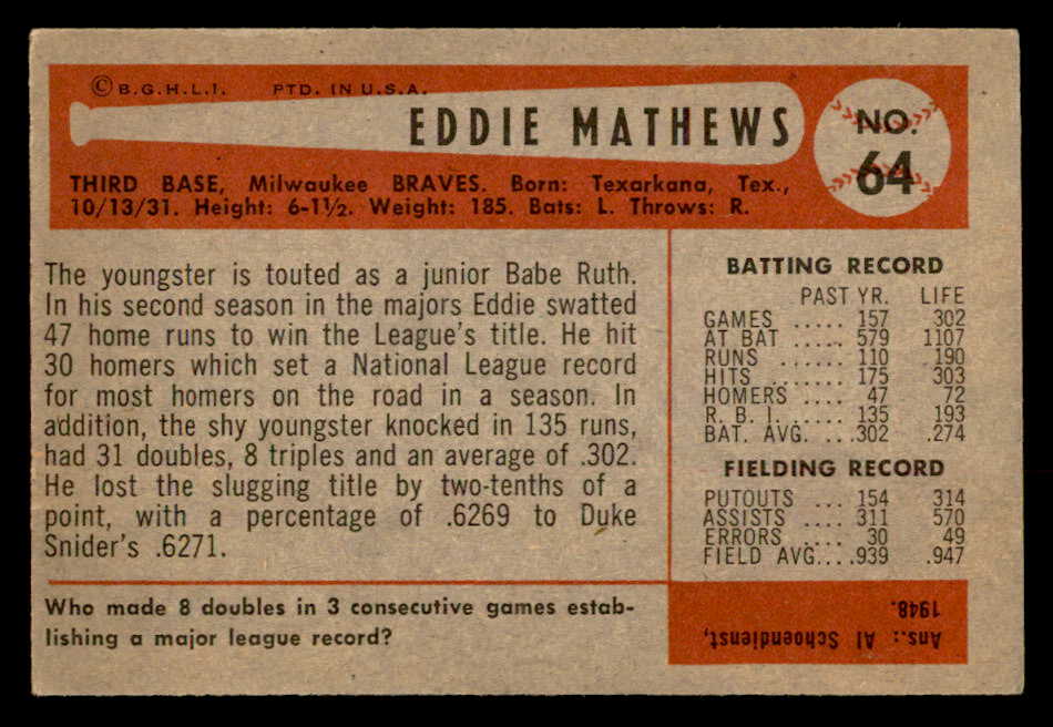 1954 Bowman Baseball #064 Eddie Mathews Braves VG-EX 539146