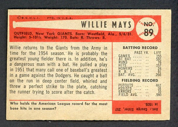 1954 Bowman Baseball #089 Willie Mays Giants EX 538552
