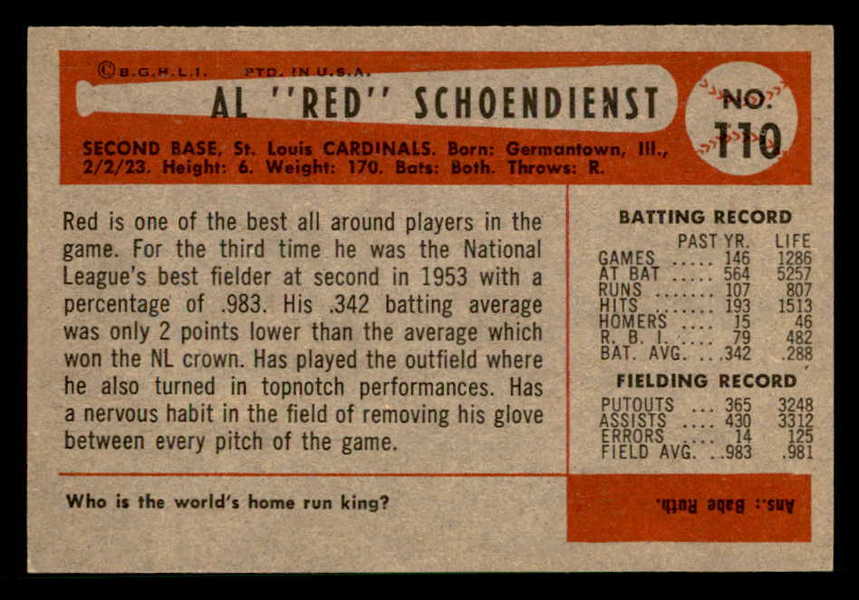 1954 Bowman Baseball #110 Red Schoendienst Cardinals EX-MT 541787