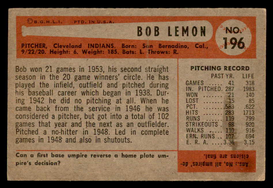 1954 Bowman Baseball #196 Bob Lemon Indians VG-EX 547239